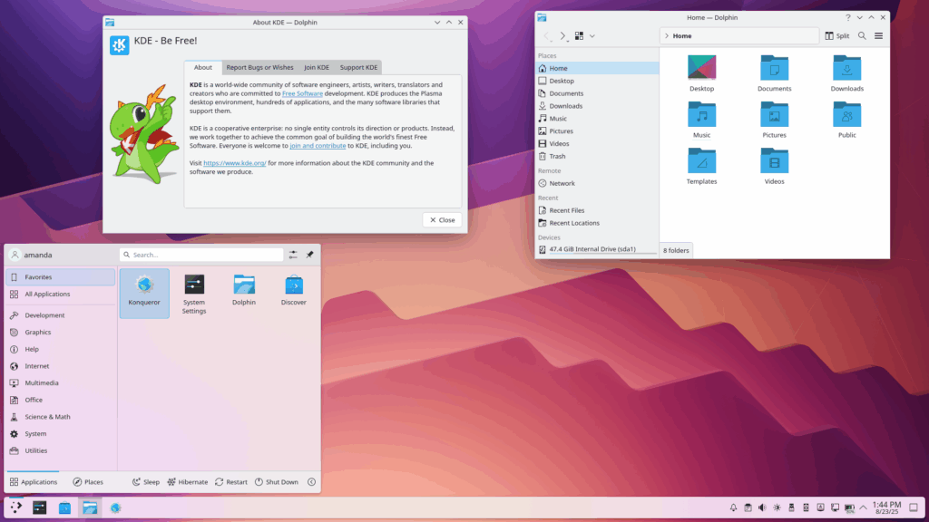 - Ein vollständiges Software-Ökosystem: Dolphin (Dateimanager), Gwenview (Bildbetrachter), Okular (PDF), Kate (Editor) und viele weitere Programme sind direkt integriert.